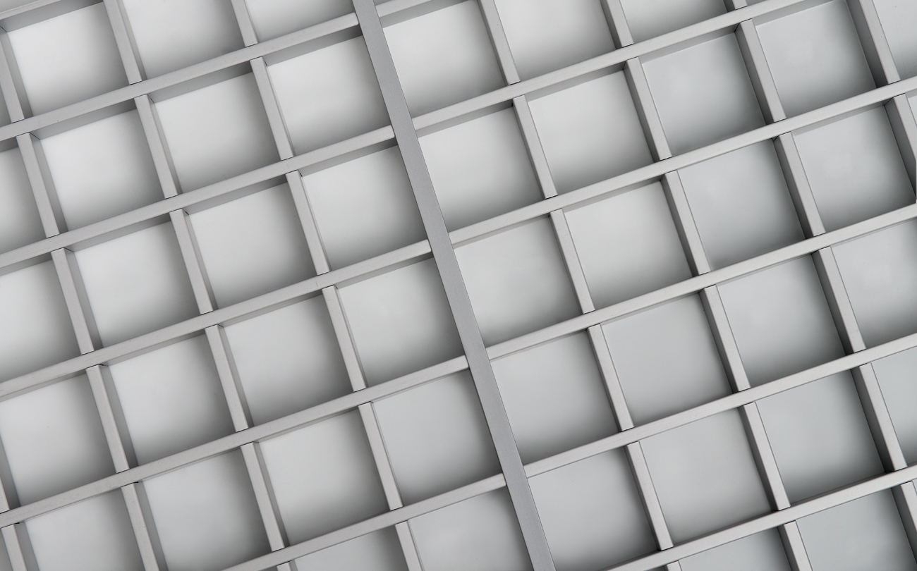 Cuadrícula Milán en aluminio prelacado de altura 40 mm y ancho de nervio 10mm, formando módulos de 600×600 mm con un tamaño de cuadrado interior según modelo.